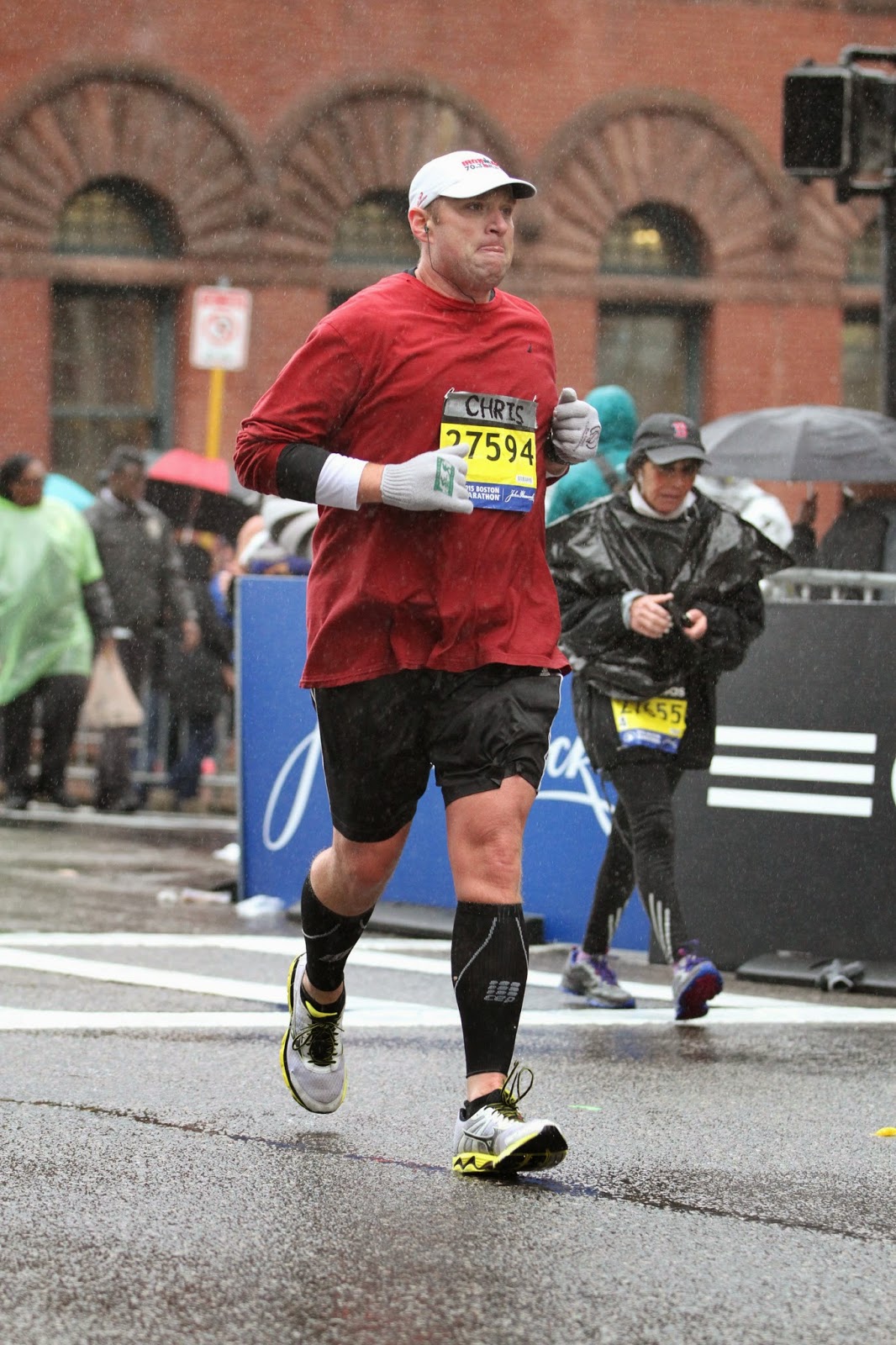 The good news is, it's all downhill from here! Literally every mile is a drop in elevation, and I allowed myself to jog the downhills, but that was all I had. The crowds were thinning and I knew the next landmark I was looking forward to was Fenway Park. The CITGO sign can be seen almost a mile away on a good day, but with the low cloud cover and fog, you could barely make it out until you were right on top of it. One of the great traditions of marathon Monday, is that the Red Sox play a home game at 11:30 a.m. The idea being that when the game is over, the crowd spills out on to the street as the marathoners are running by. The crowd is thickest at the same time the bulk of the runners are coming through and the extra cheers are good for everybody. Red Sox made short work of the Orioles today and won 7-1 which had the crowd (who just sat through the rain to watch the game) dissipating quickly to seek shelter, so there were only a few extras cheering when I passed by around 4:30.